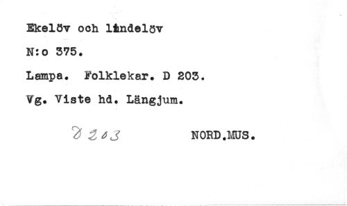 //// Ekelöv och ltndelgv //// N:o 575. //// Lampa. Folklekar. D 203. //// Vg. Viste hd. Längjum. //// ^ ^ NORD .MUS. ////
