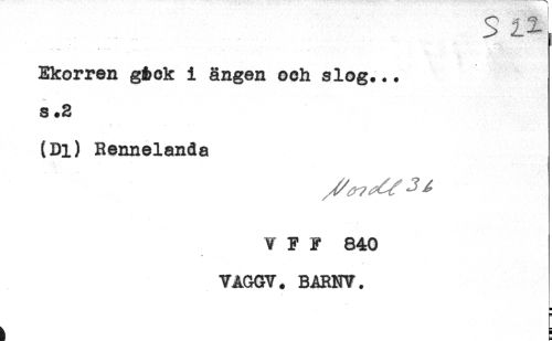 //// 5 Il- //// Ekorren g&ck i ängen och slog... //// s .2 //// (Dl) Rennelanda //// V F F 840 //// VAGGY. BARNV. //// H //// H ////