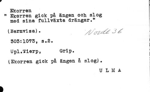 //// Ekorren //// " Ekorren gick på ängen och slog //// med sina fullvåxta drängar." //// (Barnvisa). ^ //// 303:1073, s.2. j //// Upl.Tierp, Grip. j //// (Ekorren gick på ängen å slog). ; //// [ ////