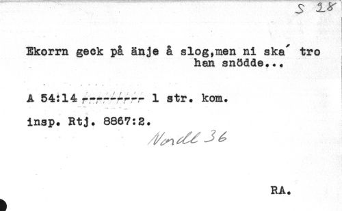 //// Ekorrn geck på änje å slog,men ni ska^ tro //// han snödde... //// < //// A 54:14 r-r--^r- 1 str. kom. //// insp. Rtj. 8867:2. //// RA. ////