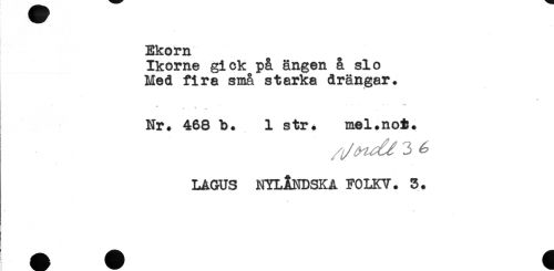 //// Ekorn //// Ikorne gick p& ängen å slo //// Med fira små starka drängar. //// * //// Nr. 468 b. 1 str. mel.not. //// 3 //// LAGUS NYLÅNDSKA FOLKV. 3. ////