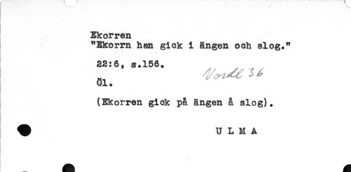 //// Ekorren //// "Ekorrn han gick i ängen och slog." //// 22:6, s.156. //// 01. //// (Ekorren gick på ängen å slog). //// ^ U L M A //// *f. . - ////