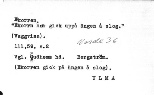 //// ^korren. //// "Ekorrn ha^ gick uppå ängen å slog." //// (Vaggvisa). -? //// /111,59, s.2 //// sa //// Vgl. ^udheias hd + Bergstri^m. //// (Ekorren gi ok på ängen å si og). //// U L M A ////
