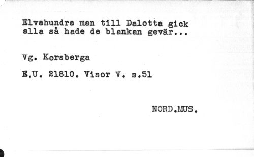 //// Elvahundra man till Dalotta gick //// alla så hade de blankan gevär... //// vg. Korsberga //// E.U. 21610. Visor V. s.51 //// NORD. ms. ////