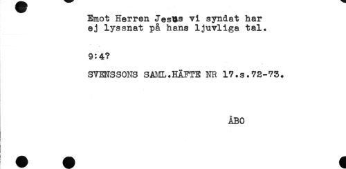 //// Emot Herren Jesus vi syndat har //// ej lyssnat på hans ljuvliga tal. //// 9:4? //// SVENSSONS SAML.HÄFTE NR 17.s.72-73. //// . //// ÅBO //// i //// I //// i ////