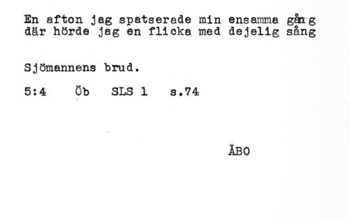 //// En afton jag spatserade min ensamma gåag //// där hörde jag en flicka med dejelig sång //// Sjömannens brud. //// 5:4 8b SLS 1 s.74 //// ÅBO ////