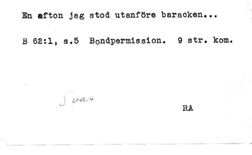 //// En afton jag stod utanföre baracken... //// B 62:1, s.5 Bondpermission. 9 str. kom. //// RA //// \ _ ___ _____ ____ ___... _____ ____ .... ////