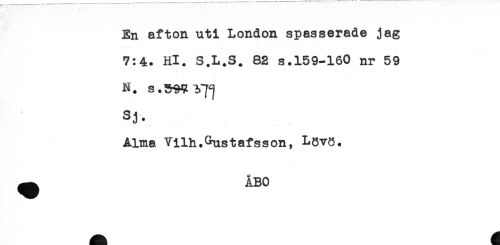 //// En afton uti London spasserade jag //// 7:4. Hl. S.L.S. 82 s.159-160 nr 59 //// N. s.593 ^ //// Sj. //// Alma Vilh.Gustafsson, Lgvö. //// ^ ÅBO ////