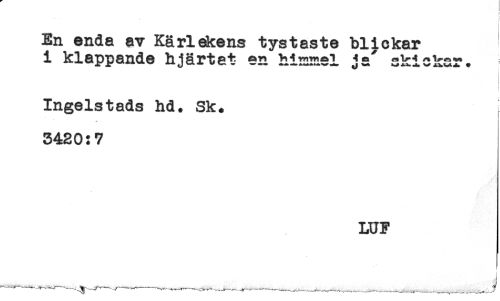 //// = //// < //// En enda av Kärlekens tystaste blickar //// i klappande hjärtat en himmel ja" skickar. //// Ingelstads hd. Sk. //// 3420:7 //// LUF //// * //// ^ ---'---,,---^____ ////