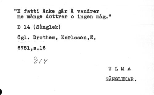 //// "E fatti änke går å vandrar //// me månge döttrer o ingen måg." //// D 14 (Sånglek) //// Ögl. Drothem, Karlsson,E. //// t % '-**' ** *. # //// -**. //// 6751,s.16 //// U L M A //// SÅNGLEKAR. ////