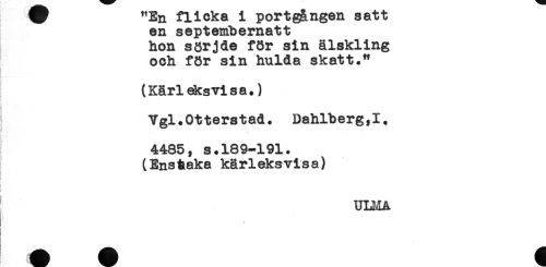 //// W "En flicka i portgången satt //// en septembernatt //// hon sörjde för sin älskling //// och för sin hulda skatt." //// (Kärl eksvisa.) //// Ygl.Otterstad. Dahlberg,!. //// 4485, s.189-191. //// (Enstaka kärleksvisa) //// t' //// < //// i. * ////