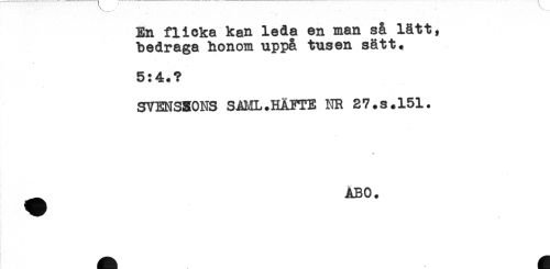 //// . ..... //// En flicka kan leda en man så lätt, //// bedraga honom uppå tusen sätt. //// 5:4.? //// SVENSSONS SAML .HÄFTE NR 27.s.151. //// ^ ABO. ////