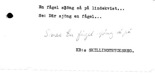 //// En fågel sRöng så på lindekvist... //// Se: Där sjöng en fågel... //// KB:s SKILLINGTRYCKSREG. //// ____ //// /
