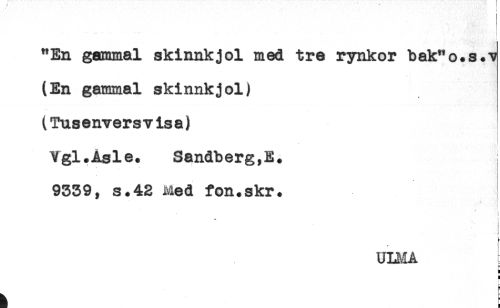 //// , . ! //// "En gammal skinnkjol med tre rynkor bak"o.s.v //// (En gammal skinnkjol) //// (Tusenversvisa) //// t //// Ygl.Asle. Sandberg,E. //// i //// 9339, s.42 Med fon.skr. //// < //// i //// ULMA //// & //// H ////