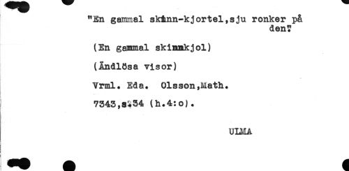 //// "En gammal sk&nn-kj ortel,sju ronker på //// den? //// (En gammal skimmkjol) //// (Ändlösa visor) //// Vrml* Eda. Olsson,Math. //// 7343,aS34 (h.4:o). //// UIHA ////