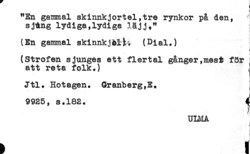 //// a //// i //// "En gammal skinnkjortel,tre rynkor på den, ^ //// sjlng lydiga,lydiga låjj," //// j //// (En gammal sklnnkjbl^ (Dial.) //// * //// * //// (Strofen sjunges ett flertal gånger ,mesi för i //// att reta folk.) j //// < //// ! //// Jtl. Hotagen. Granberg,E+ //// 9925, s.182. ^ //// ULMA //// ) //// j //// t t ////
