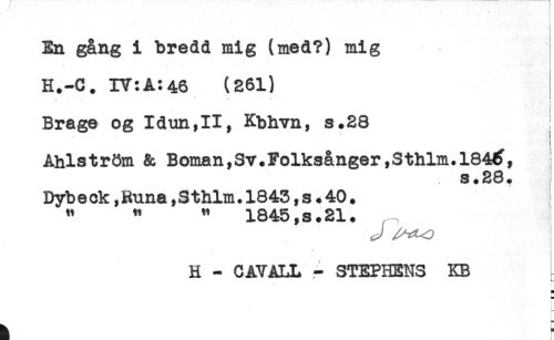 //// En gång i bredd nig (med?) mig //// H.-C. IV:A: 46 (261) //// Brage og Idun,II, Kbhvn, s.28 //// i //// Ahlström & Boman,Sv.Folksånger ,Sthlm.184^, I //// s.28. //// Byb e ck,Runa,Sthlm.1843,s.40. //// " " * 1845,s.21. //// - * //// /H - C AV ALL r STEPHENS KB //// t //// r* //// h E ////