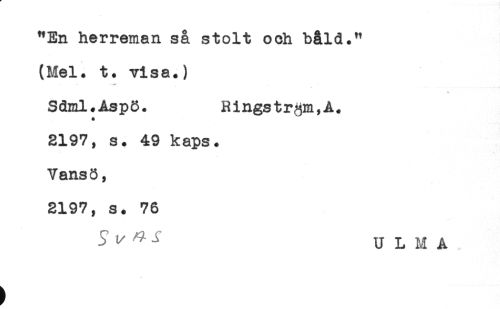 //// "En herreman så stolt och båld." //// * //// (Mel. t. visa.) //// Sdml.AspS. Ringström,A. //// 2197, s. 49 kaps. //// Vansö, //// 2197, s. 76 //// ^ M ^ i U L M A ////