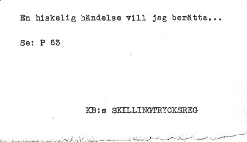 //// En hiskelig händelse vill jag berätta... //// Se: P 63 //// i //// KB:s SKILLINGTRYCKSREG //// ^_____r, , ---^ ^r ^^ ////