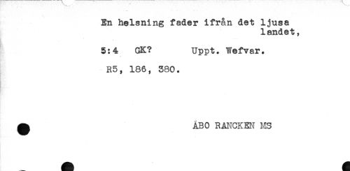 //// En helsning fader ifrån det ljusa //// landet, //// 5:4 GK? Uppt. Wefvar. //// R5, 186, 380. //// ^ ÅBO RANCKEN HS ////