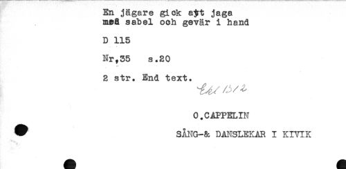 //// En jägare gick ajrt jaga //// mea sabel och gevär i hand //// t //// D 115 //// y- * //// Nr,55 s.20 //// 2 str. End text. //// ^ //// /O.CAPPELIN //// ^ SÅNG-& DANSLEKAR I KIVIK ////