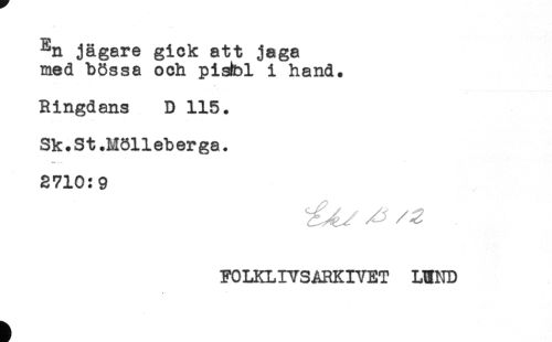 //// En jägare gick att jaga //// med bössa och pisbl i hand. //// Ringdans D 115. //// Sk.S t.M311eb er ga. //// ^ - //// 2710:9 //// FOLKLIYSARKIVET LUND ////