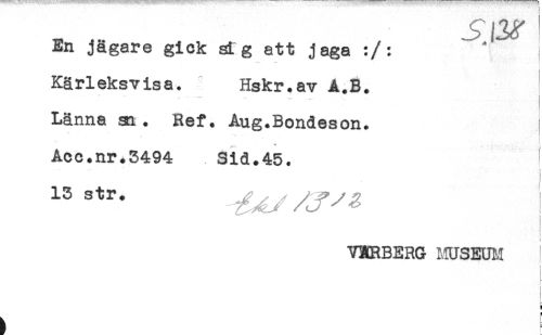 //// En jägare gick sig att jaga :/: //// i //// Kärleksvisa. Hskr.av A.B. //// - *** *-* //// Länna m. Ref. Aug.Bondeson. //// ! * ^ //// " : //// Acc.nr.3494 Sid.45. //// i //// ! //// i //// V^RBERG MUSEUM i //// { //// t //// i //// H //// ^ t ////