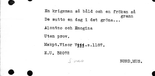//// En krigsman så båld och en fröken så //// grann //// De sutto en dag i det gröna... //// * //// Alontzo och Emogina //// ! //// Utan prov. //// t < * * . //// Mskpt.Visor V^.s.1187. //// E.U. 32072 //// r ////
