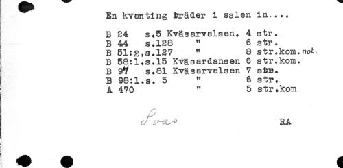 //// En kvanting träder i salen in.... //// B 24 s<5 Kväsarvalsen. 4 str. //// I B 44 s.128 " 6 str. //// B 51:2,s.l27 " 8 str.kom.not //// B 58:1.s.15 Kväsardansen 6 str.kom. //// ! B 9*? s.81 Kväs arvals en 7 s&B. //// B 98:1.s. 5 " 6 str. //// ; A 470 " 5 str.kom //// r, RA //// ! //// i //// j ////