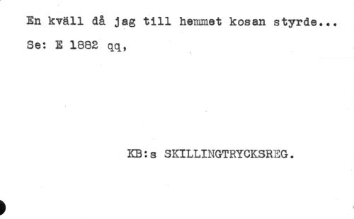 //// En kväll då jag till hemmet kosan styrde... //// * //// Se: E 1882 qq, //// KB:s SKILLINGTRYCKSREG. ////