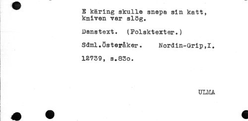 //// E käring skulle snepa sin katt, //// kniven var slög. //// i - //// Danstext. (Polsktexter.) //// Sdml.Österåker. Nordin-Grip,I. //// 12739, s.83o. //// ! //// i //// t- //// ULI,IA //// ! //// i ////