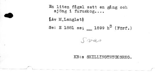 //// En liten fågel satt en gång och //// ^^ sjöng i furuskog.... //// $Av M.Langlet} //// * //// Se: E 1881 ss; _ 1899 h^ (Förf.) //// KB:s SKILLINGTRYCK SRE G. ////