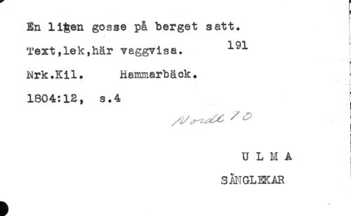 //// H //// En ligen gosse på berget satt. //// Text,lek,här vaggvisa. ^^ //// < //// Nrk.Kil. Hammarbäcks //// t //// < //// ! //// 1804:12, s.4 //// ^^ i //// ! //// U L M A //// : //// SÅNGLEKAR ////