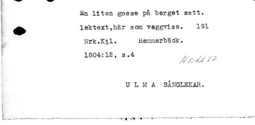 //// En liten gosse på berget satt. //// i ^^ lektext,här som vaggvisa. 191 //// L Nrk.Kil. Hammarbäck. //// Hy..? - //// 1804=12, s.4 ^^^ //// ) //// i U L M A SÅNGLEKAR. ////