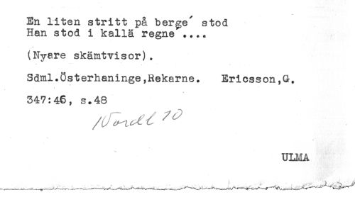 //// En liten stritt på berge' stod //// Han stod i kalla regne .... //// (Nyare skämtvisor). //// Sdml.8sterhaninge,Rekarne. Ericsson,G. //// 347:46, s*48 //// ULMA ////