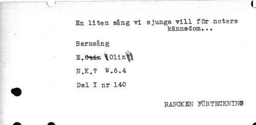 //// En liten sång vi sjunga vill för noters //// kännedom... //// ! //// Barnsång //// N.K.? W.6.4 //// ^ Del I nr 140 //// RANCKEN FÖRTECKNING ////