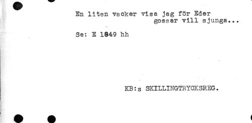 //// En liten vacker visa jag för Eder //// gossar vill sjunga... //// Se: E 1849 hh //// KB:s SKILLINGTRYCKSREG. //// .1 //// ' _ ////