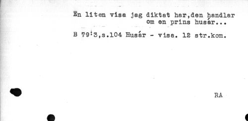 //// En liten visa jag diktat har,den handlar //// om en prins husar... //// * - - - . .. - //// B 7913,5.104 Husar - visa. 12 str.kom. //// - //// * //// -* ////