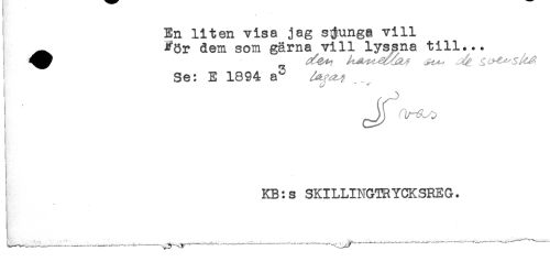 //// En liten visa jag sjunga vill //// ' ^ Fgy dem som gärna vill lyssna till... //// Se: E 1894 a^ //// cJ^ ^' * //// KB:s SKILLINGTRYCKSREG. ////