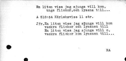 //// t* //// En liten visa jag sjunga vill kom, //// unga flickor,och lyssna till... //// * * . //// A 518:64 Kärleksvisa 11 str. //// Jfr.En liten visa jag sjunga vill kom //// vackra flickor och lyssnen till //// En liten visa jag sjunga vill o, //// vackra flickor kom lyssnen till... //// ^ RA ////