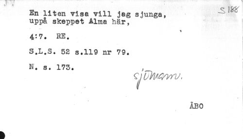 //// En liten visa vill jag sjunga, ^ ' //// uppå skeppet Alma här, //// * -r. //// 4:7. RE. //// S.L.S. 52 s.119 nr 79. //// t //// N. s. 173. //// I //// t //// * //// * //// 1* //// ABO ////