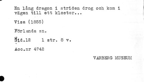 //// En lång dragon i striden drog och kom i t //// vägen till ett kloster... //// - - * //// Visa (1855) //// Förlanda sn. //// 3id.l2 1 str. 8 v. //// ** //// Aoc.nr 4742 //// VARBERG mSEUH ////