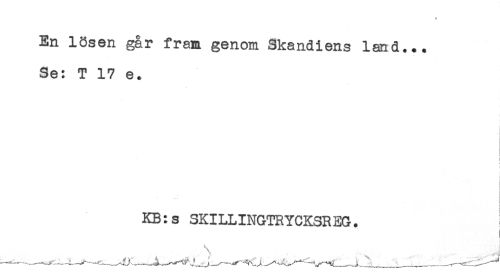 //// En lösen går fram genom Skandiens land... //// Se: T 17 e. //// - //// < //// - //// i //// ! //// KB:s SKILLINGTRYCKSREG. ////