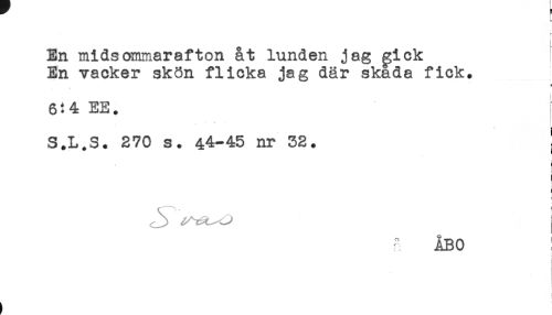 //// En midsommarafton åt lunden jag gick //// En vacker skön flicka jag där skada fick. //// << //// ** //// 614 EE. //// S.L.S. 270 s. 44-45 nr 32. ! //// i //// ! //// ÅBO ' ////