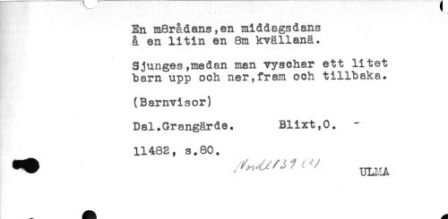 //// En m8rådansyen middagsdans //// å en litin en 8m kvällanä. //// Sjunges,medan man vyschar ett litet //// barn upp och ner,fram och tillbaka. //// (Barnvisor) //// Dal.Grangärde. Blixt,0. - //// 11482, s.80. //// ** '-i ^ ' ' ////