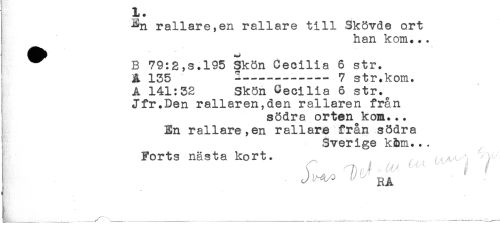 //// } ^n rallarenen rallare till Skövde ort //// ! han kom... //// B 79:2,s.l95 Skön Cecilia 6 str. //// A 135 ---7 str.kom. //// A 141:32 Skön Cecilia 6 str.^ //// Jfr.Den rallaren,den rallaren från //// södra orten kom... //// En rallare,en rallare från södra //// Sverige k&m... //// Forts nästa kort. ^ //// j ^ ^ //// L-____^____- --... - ////