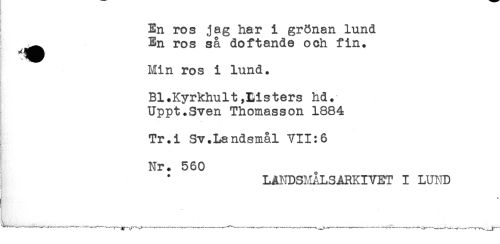 //// ! //// I En ros jag har i grönan lund //// ^ En ros så doftande och fin. //// Min ros i lund. //// Bl.Kyrkhult,Listers hd. //// Uppt.Sven Thomasson 1884 //// Tr.i Sv.Landsmål VII:6 //// Nr. 560 //// LANDSIvIÅLSÅRKIVET I LUND //// ! . . - ////