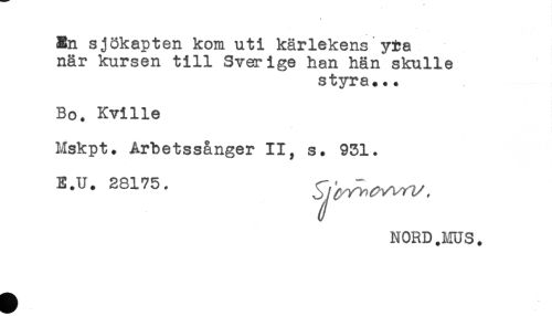 //// Bn sjökapten kom uti kärlekens yta //// när kursen till Sverige han hän skulle //// styra... //// Bo. Kville //// Mskpt. Arbetssånger II, s. 931. //// E.U. 28175. //// NORD.MUS. ////