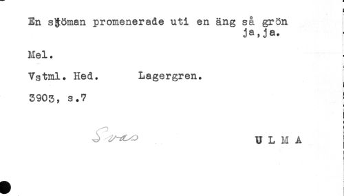 //// E //// En sjöman promenerade uti en äng så grön //// ja,ja. //// i //// Mel. //// - *- * < //// Vstml. Hed. Lagergren. j //// 3903, s.7 //// ) //// ' 'j //// i //// .. .. -xt- -' U L M A //// < ////