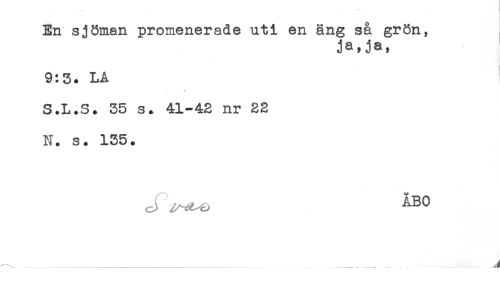 //// En sjöman promenerade uti en äng så grön, //// ja.ja. //// 9:5. LA //// S.L.S. 35 s. 41-42 nr 22 //// N. s. 135. //// ^...' ... ...J ////